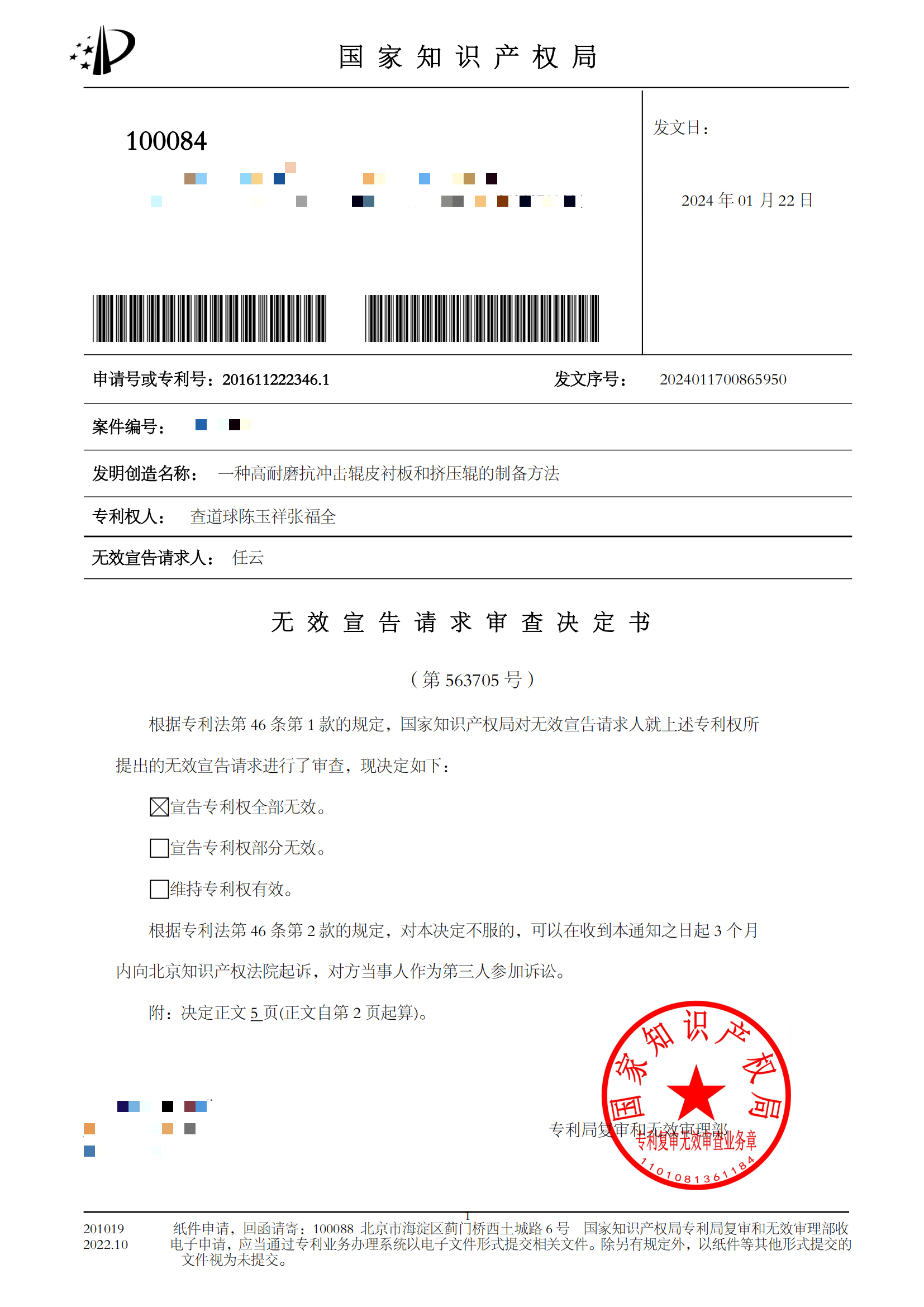 近日,由北京励诚知识产权代理有限公司代理的一件专利无效宣告结案。国家知识产权局作出第563705号无效决定,宣告专利申请号为201611222346.1,名称为“一种高耐磨抗冲击辊皮衬板和挤压辊的制备方法”的发明专利权全部无效。