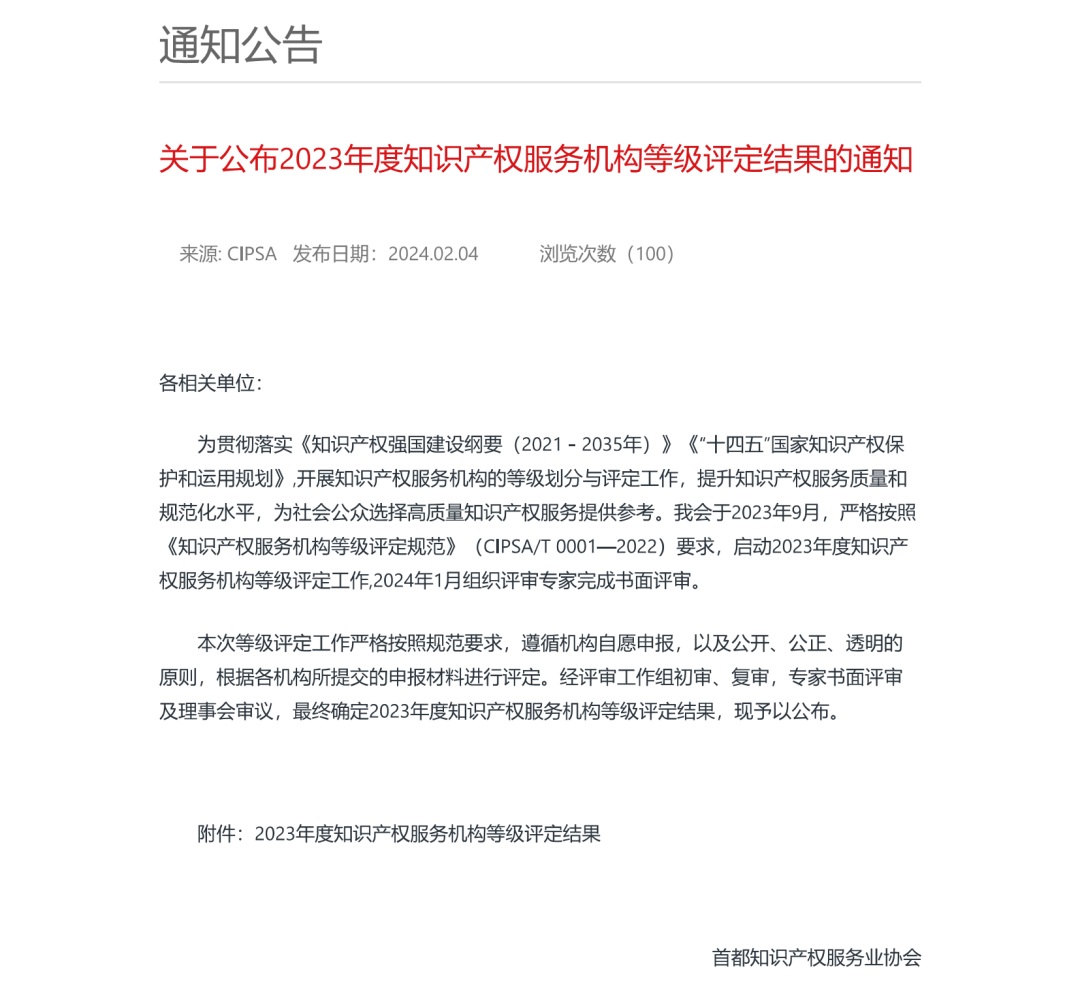 本次评定工作,由首都知识产权服务业协会于2023年9月,严格按照《知识产权服务机构等级评定规范》(CIPSA/T 0001—2022)要求,启动2023年度知识产权服务机构等级评定工作,经评审工作组初审、复审,专家书面评审及理事会审议,最终确定2023年度知识产权服务机构等级评定结果。