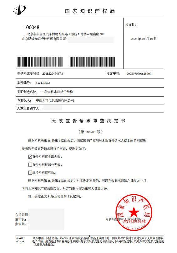 近日,北京励诚知识产权代理有限公司再传捷报 —— 在 “一种电机永磁转子结构”(专利号:201822044474.4 )专利无效案中,凭借专业、精准的服务,助力客户取得专利权全部无效的胜利!