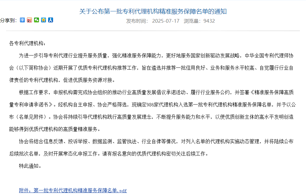 近日,中华全国专利代理师协会正式发布《关于公布第一批专利代理机构精准服务保障名单的通知》。经过机构自主申报、协会严格筛选,全国仅986家代理机构脱颖而出,北京励诚凭借良好的信用、卓越的业务水平及高度的行业自律责任,光荣跻身首批名单!